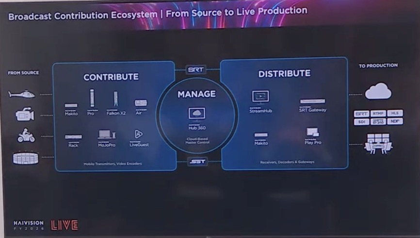 Tra gli elementi centrali dell’ecosistema figura la piattaforma Haivision Hub 360, affiancata dall’applicazione MoJoPro, che consente la ricezione di flussi SRT su dispositivi mobili e abilita anche il ritorno video verso gli operatori sul campo.