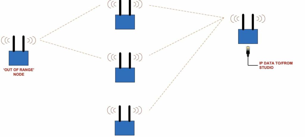 Una rete MESH consente a più trasmettitori (fino a 120), spesso chiamati “nodi”, di formare una rete IP bidirezionale, ciascuna delle quali condivide i dati IP e tutte utilizzano un singolo canale di frequenza.