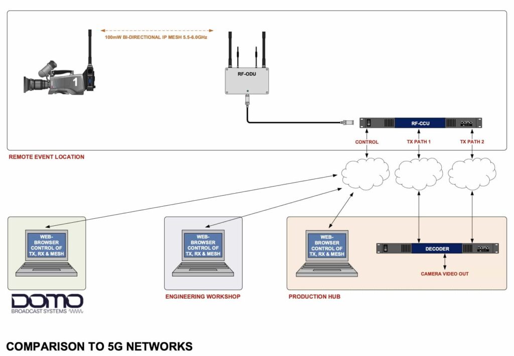 Una configurazione tipica consiste nell’utilizzare il sistema MESH per fornire una dorsale IP che copra l’intera area della produzione/evento dando a tutti gli operatori di ripresa e al personale di produzione l’accesso alle strutture sopra menzionate.