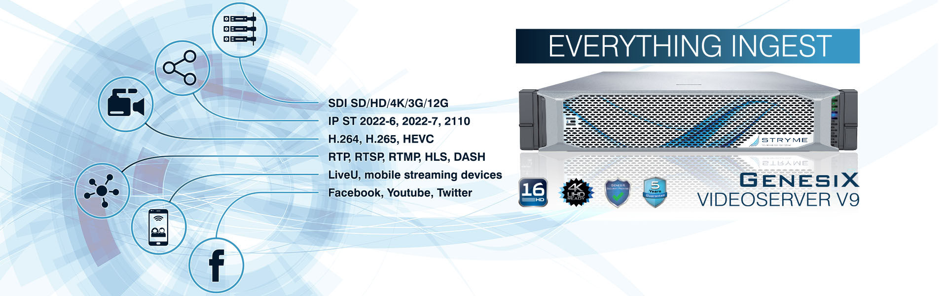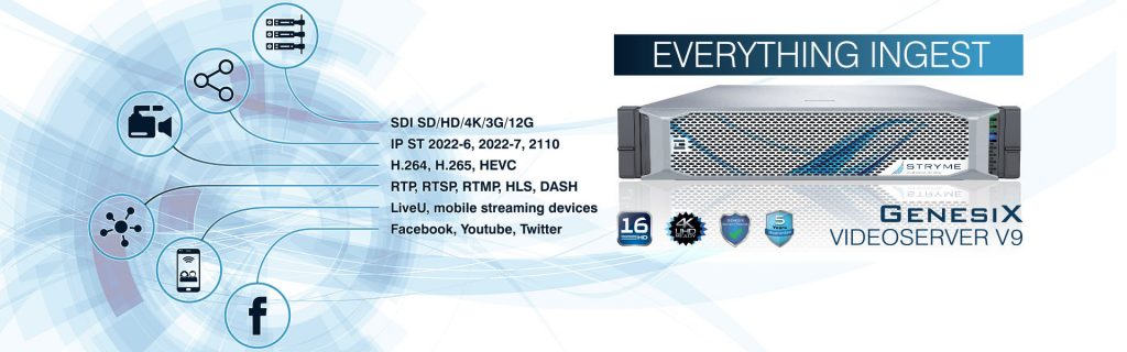Ingest, Playout and Media Asset Management are part of the basic configuration. STRYME forges ahead into the future of broadcasting with its 9th generation flagship product. Redesigned to ingeniously ingest every format and every codec – used today and still to come – the GENESIX VideoServer V9 sets new standards.
