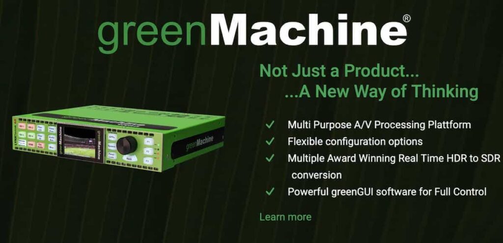 Gli utenti semplicemente caricano la licenza di funzionalità di cui hanno bisogno in ogni data occasione e la macchina si trasforma in un sincronizzatore di frame, convertitore UPXD, generatore di test o embedder e de embedder, ma soprattutto – ed ecco il vero vantaggio – greenMachine consente la gestione e conversione dell’HDR dinamico, con up-conversione statica da SDR con LUT personalizzate, e una down-conversione unica e protetta multi-segmento per fotogramma, completamente dinamica, da HDR a SDR, che conserva oltre il 90% dei dettagli percepiti.