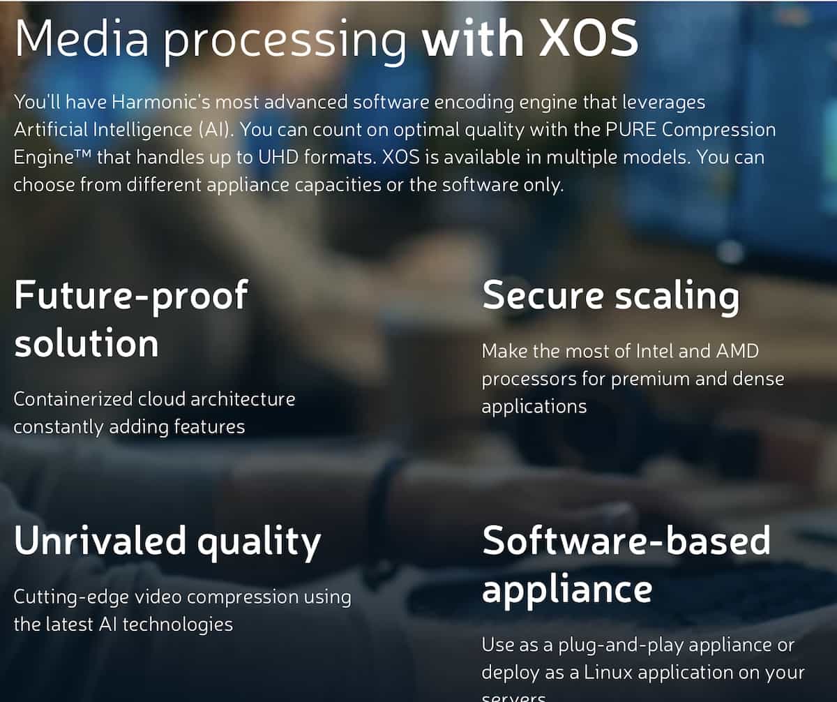 Harmonic, sul sito ufficiale, dedica a questo prodotto molti casi d’uso ufficiali: https://www.harmonicinc.com/video-streaming/video-encoders-processing/xos-advanced-media-processor/)